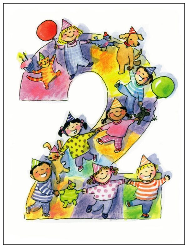 This fun child’s 2nd Birthday Card is charmingly illustrated by artist Shelley Dieterichs with kids and animals in the shape of the number two wearing birthday party hats and holding balloons! Inside the child’s 2nd birthday card the message reads “All your friends are wishing you Happy Birthday! Today you are TWO!”ย There are more cute birthday cards for kids, along with party invitations, kid’s thank you notes and great gifts in the Good Buddy Notes store!